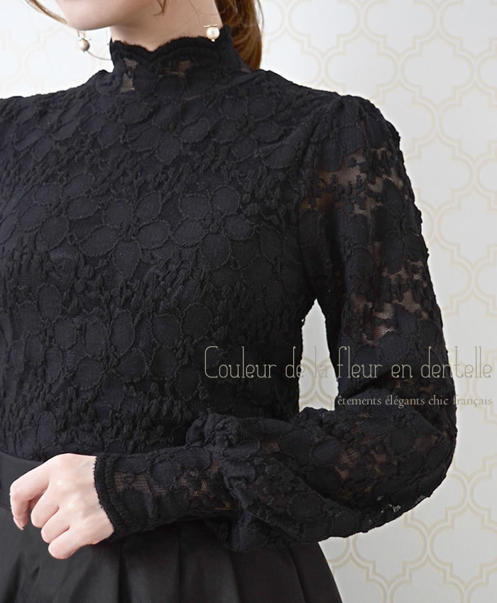 トップス 【ゆうメール便送料無料】 スタンドカラー ブラウス レディース 長袖 カットソー パフスリーブ レース 大人 可愛い きれいめ プチプラ ブラック (スタンドカラーフラワーレーストップス)[カービーズ][ 春 夏 春夏 ]