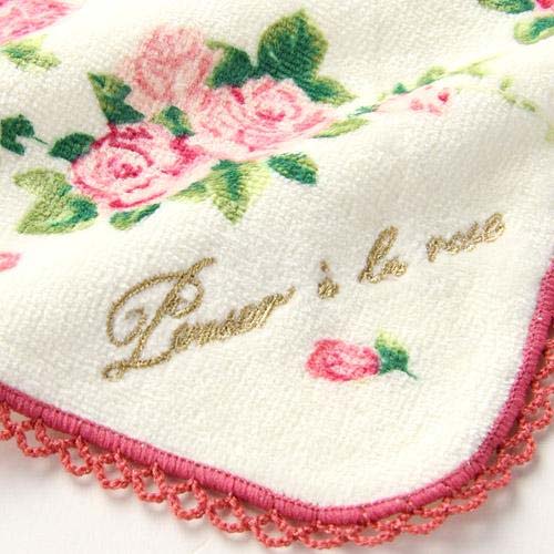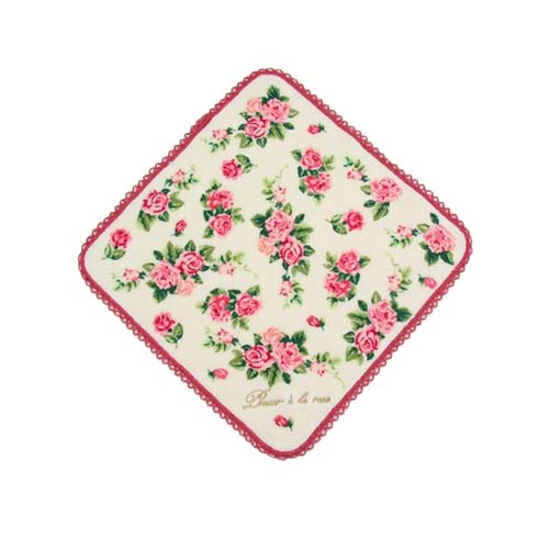 ピコットレースの縁取りと金のロゴ刺繍入りが ポイントのパンセアラローズ柄のタオルハンカチです。